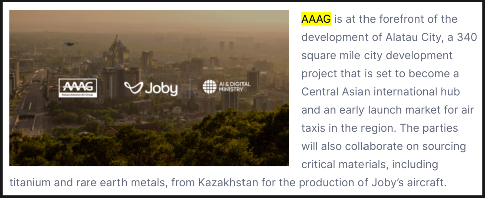 카자흐스탄 계약의 상대방인 AAAG(Alatau Advance Air Group) 은 340제곱마일 규모의 ‘알라타우 시티(Alatau City)’ 개발 프로젝트를 추진 중인 기업입니다. 이 신도시는 첨단 기술과 친환경 교통을 중심으로 설계되고 있으며, 조비 항공기의 첫 상용 운항 도시로 지정되었습니다.