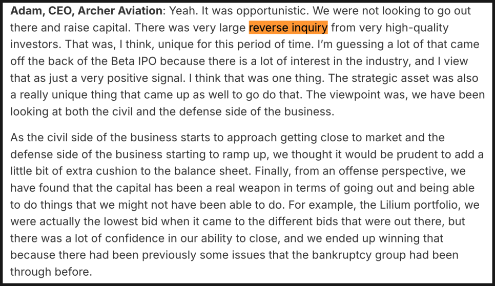 아처 경영진 측은 “이번 자금 조달은 계획된 것이 아니라, 투자자들이 먼저 제안한 역제안(reverse inquiry)이었다”고 밝혔습니다. 특히 경쟁사 베타 테크놀로지스(Beta Technologies) 의 IPO 이후, eVTOL 산업에 대한 투자 열기가 높아진 점이 큰 영향을 미쳤다고 설명했습니다. 그러면서 “유동성은 곧 신뢰”라며, 대형 항공사·정부기관이 파트너를 선택할 때 ‘10년 뒤에도 살아남을 회사인가’ 를 가장 먼저 본다고 강조했습니다.