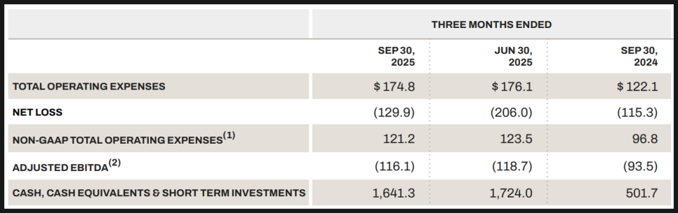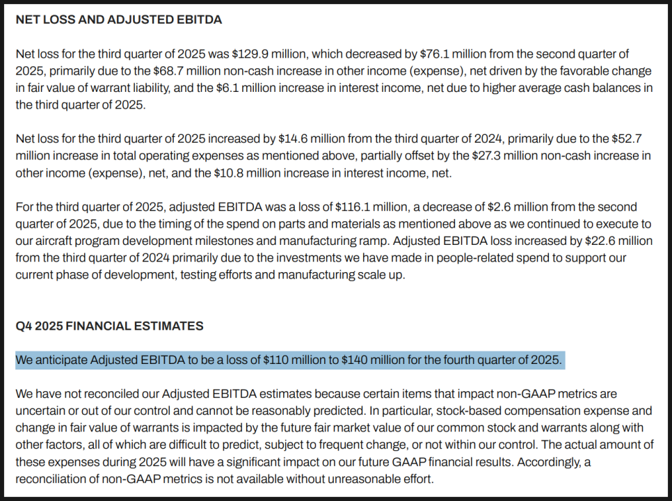 아처의 2025년 3분기 실적에서 주당 순손실은 약 0.20달러로, 전년 동기(-0.29달러)보다 개선됐습니다. 하지만 조정 EBITDA 손실(영업이익에서 세금·이자·감가상각 등을 제외한 손실) 은 약 1억 1,600만 달러로, 작년 같은 기간의 9,350만 달러보다 확대됐습니다.