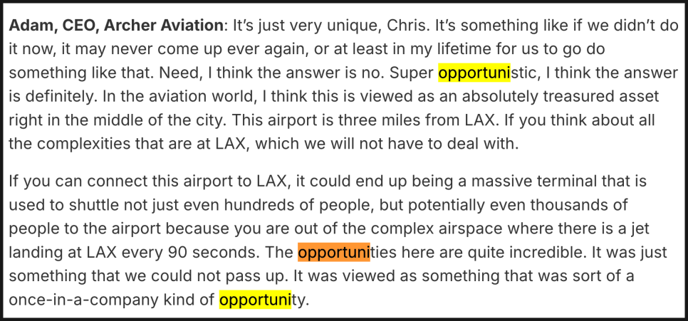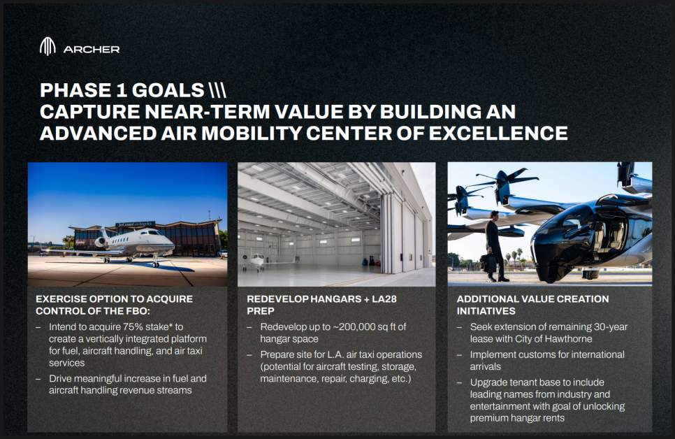 또한 CEO 골드스타인은 이번 인수를 두고, “이런 기회는 평생 한 번뿐”이라고 말했는데요. 해당 공항은 이미 흑자 운영 중이고, 2055년까지 장기 임대계약을 보유하고 있다고 하는데요. 아처는 기존 격납고의 2배 규모 확장권도 확보했다고 합니다.