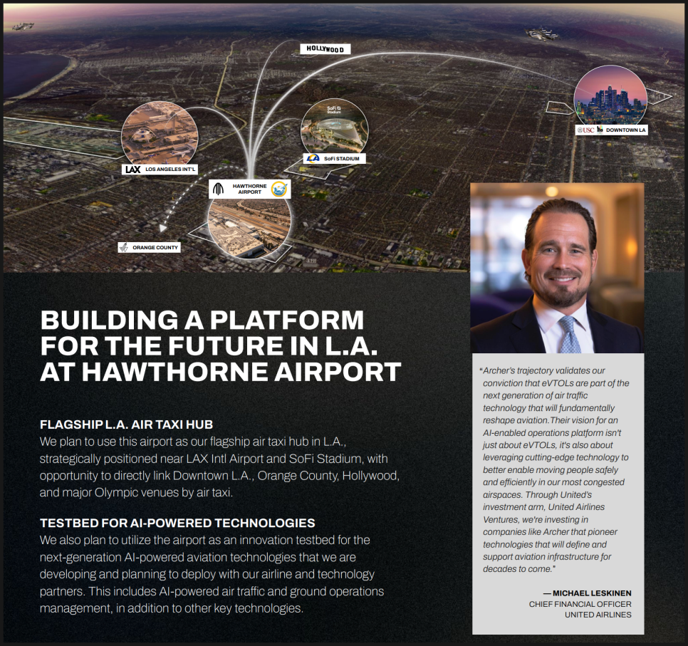 흥미로운 점은 일론 머스크(Elon Musk)의 보링 컴퍼니(The Boring Company) 터널이 공항 아래를 지나간다는 사실인데, 최근 들어 아처와 일론 머스크와의 접점이 자꾸만 연결된다는 점에 투자자들은 주목하고 있는 것 같습니다.