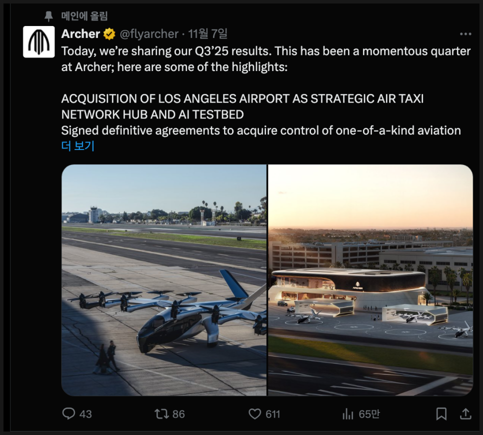 아처의 CEO 애덤 골드스타인(Adam Goldstein) 은 이번 3분기 실적 발표에서 “첨단 항공의 시대는 이제 먼 미래가 아니라, 눈앞의 현실이 되었다.”라고 언급을 했는데요.