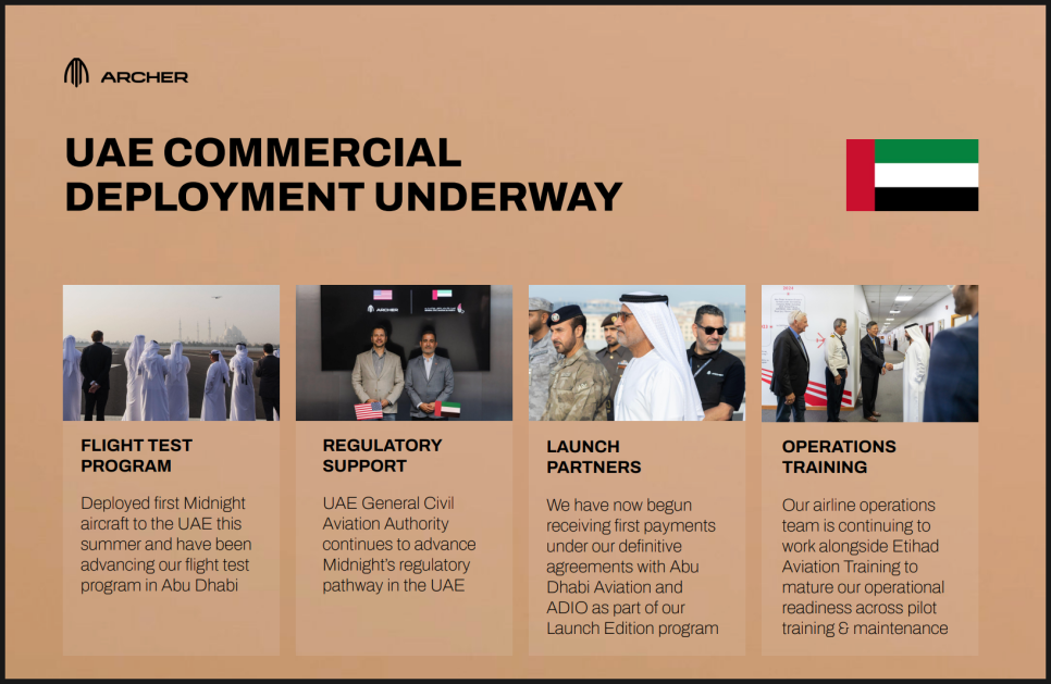 올해 여름 아랍에미리트(UAE) 아부다비에서 시범 비행을 개시했고, 현지 ‘런치 에디션(Launch Edition)’ 프로그램 활동에 대한 첫 매출도 이미 발생했다고 밝혔습니다. 아처는 현지 항공사 아부다비 에비에이션(Abu Dhabi Aviation) 과 협력 중인데요. 현재 UAE 정부의 인증 절차를 진행 중이며, 2026년 3분기 상용 여객 운항 허가를 목표로 하고 있습니다.
