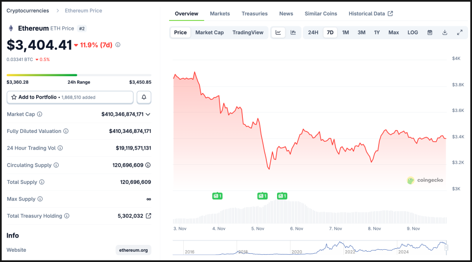 아크 인베스트와 JP 모건이 비트마인 주식을 매수하며 간접적으로 매집한 이더리움은 약 12% 하락,