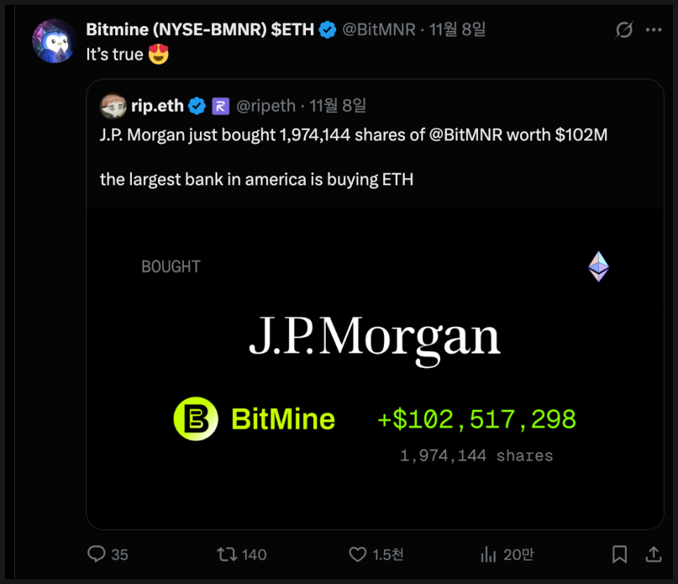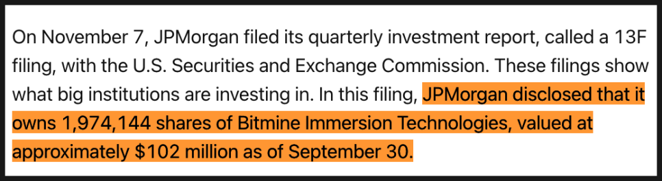 11월 7일, JP모건은 분기별 보유 자산을 보고하는 ‘13F 보고서’를 SEC에 제출했습니다. 이 보고서는 대형 기관 투자자들이 어떤 자산을 보유하고 있는지를 공개하는 자료인데요. 이번 보고서에서 JP모건은 비트마인 이머전 테크놀로지(BitMine Immersion Technologies) 주식 1,974,144주, 평가 금액으로 약 1억 200만 달러(한화 약 1,400억 원)를 보유하고 있다고 명시했습니다.