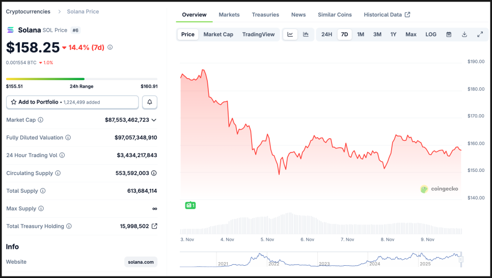 ETF 순유입 측면에서 흥하고 있다는 솔라나는 지난 7일 간 14% 이상 하락했으며