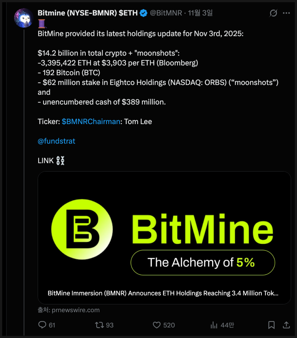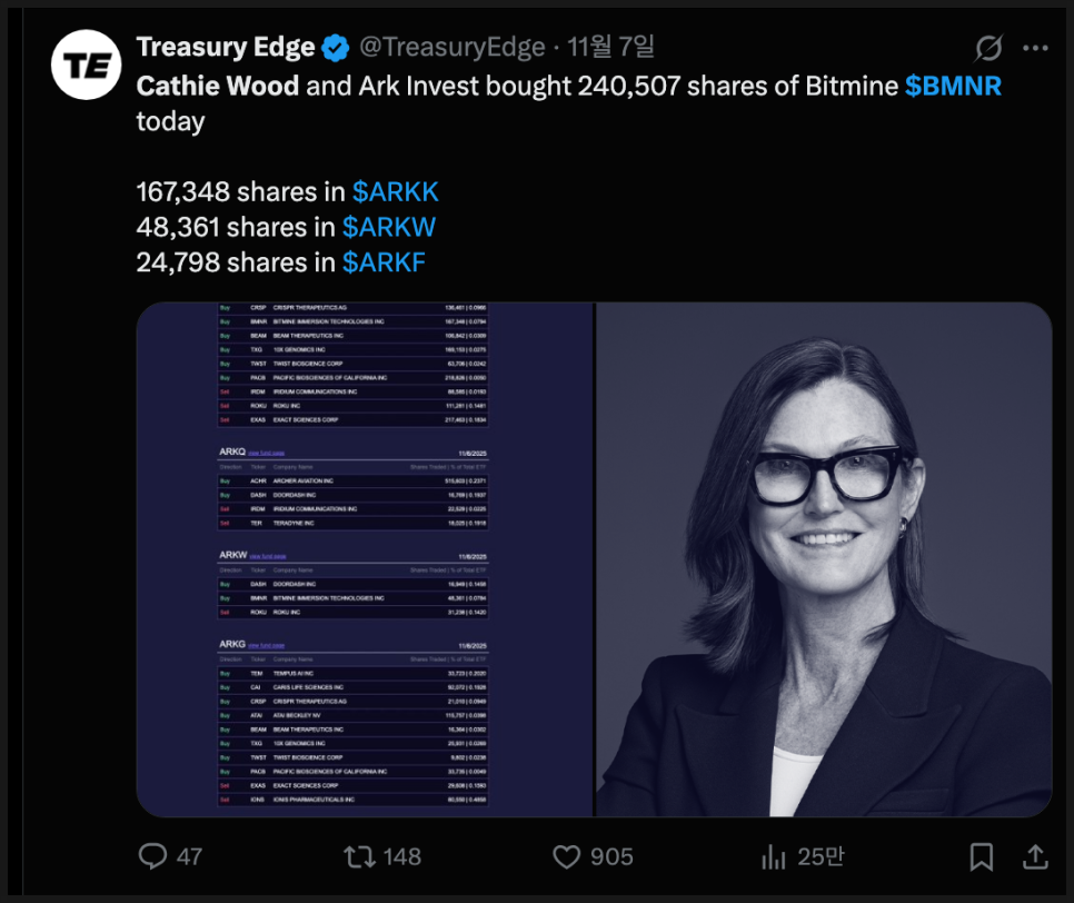 트럼프 형제의 아메리칸 비트코인이 비트코인을 매수한 반면, 이더리움에 투자하는 기업 주식을 매수한 곳도 있었습니다. 바로 혁신 투자로 유명한 캐시 우드(Cathie Wood)의 아크인베스트(Ark Invest)가 비트마인 이머전 테크놀로지(BitMine Immersion Technologies, 티커: BMNR) 주식을 대거 매수한 겁니다.