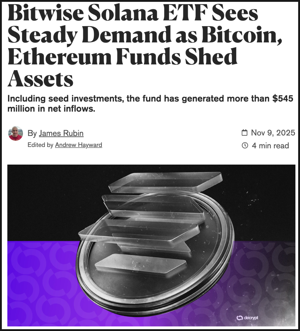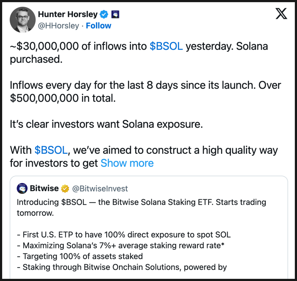 흥미로운 점은, 솔라나(Solana)의 가격이 한 달 사이 약 30% 가까이 하락했음에도 자금이 계속 들어오고 있다는 사실입니다. 비트와이즈의 CEO 헌터 호슬리(Hunter Horsley)는 “런칭 이후 8일 연속으로 순유입이 이어지고 있다. 투자자들이 솔라나 노출을 원하고 있음이 분명하다”고 전했습니다.