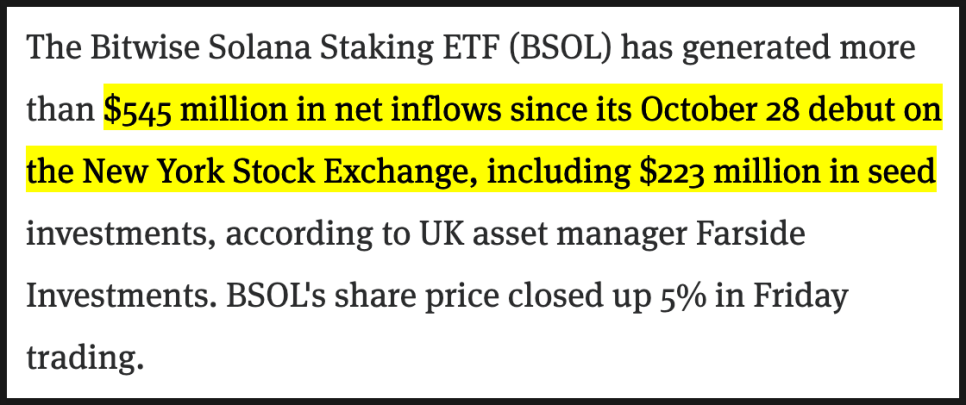 해당 ETF는 10월 28일 뉴욕증권거래소에 상장된 이후 단 한 번도 자금 유입이 끊기지 않았다고 하는데요. 현재까지 총 순유입액은 5억 4,500만 달러, 그중 2억 2,300만 달러는 초기 시드 자금으로 구성돼 있습니다.