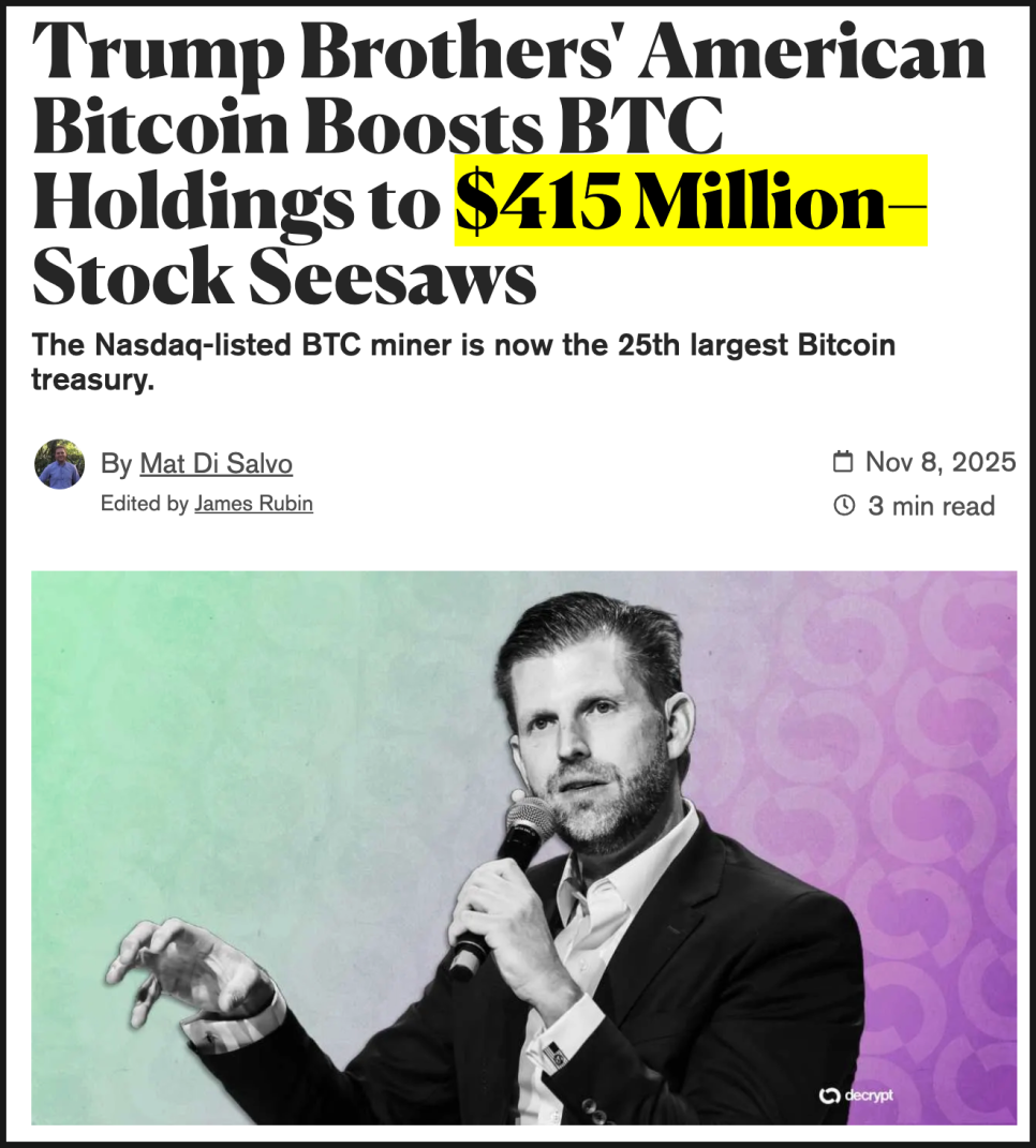 미국 대통령 도널드 트럼프의 두 아들, 에릭 트럼프와 도널드 트럼프 주니어가 후원하는 비트코인 채굴 및 자산 운용사 아메리칸 비트코인(American Bitcoin, 티커: ABTC)이 최근 비트코인 보유량을 크게 늘렸습니다.