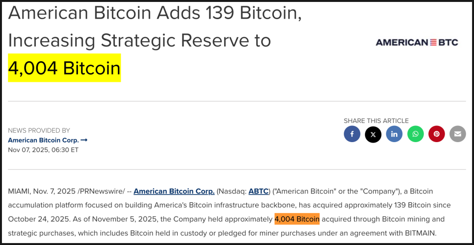 현재 아메리칸 비트코인은 총 4,004개의 비트코인, 약 4억 1,500만 달러(한화 약 5,600억 원)를 보유하고 있으며, 전 세계 상장사 중 25번째로 많은 규모입니다. 회사는 지난 10월 24일부터 11월 5일까지 약 1,400만 달러 규모의 비트코인 139개를 추가 매입했다고 밝혔습니다.