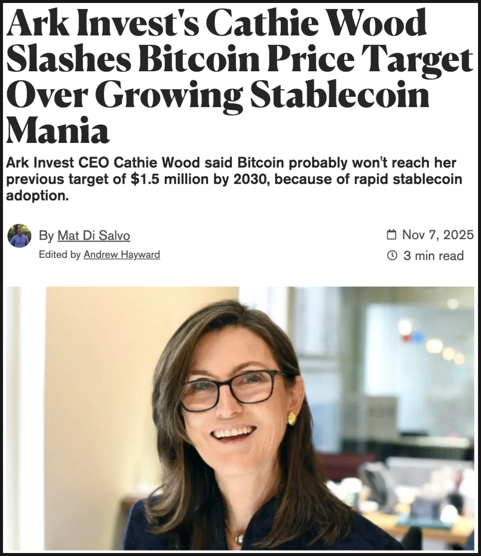 CNBC와의 인터뷰에서 캐시 우드는 “스테이블코인이 신흥국 시장에서 우리가 원래 비트코인이 수행할 것이라 예상했던 역할을 대신하고 있다”며 “이로 인해 비트코인 가격의 상단 예측에서 약 30만 달러 정도를 조정해야 한다고 본다”고 밝혔습니다.