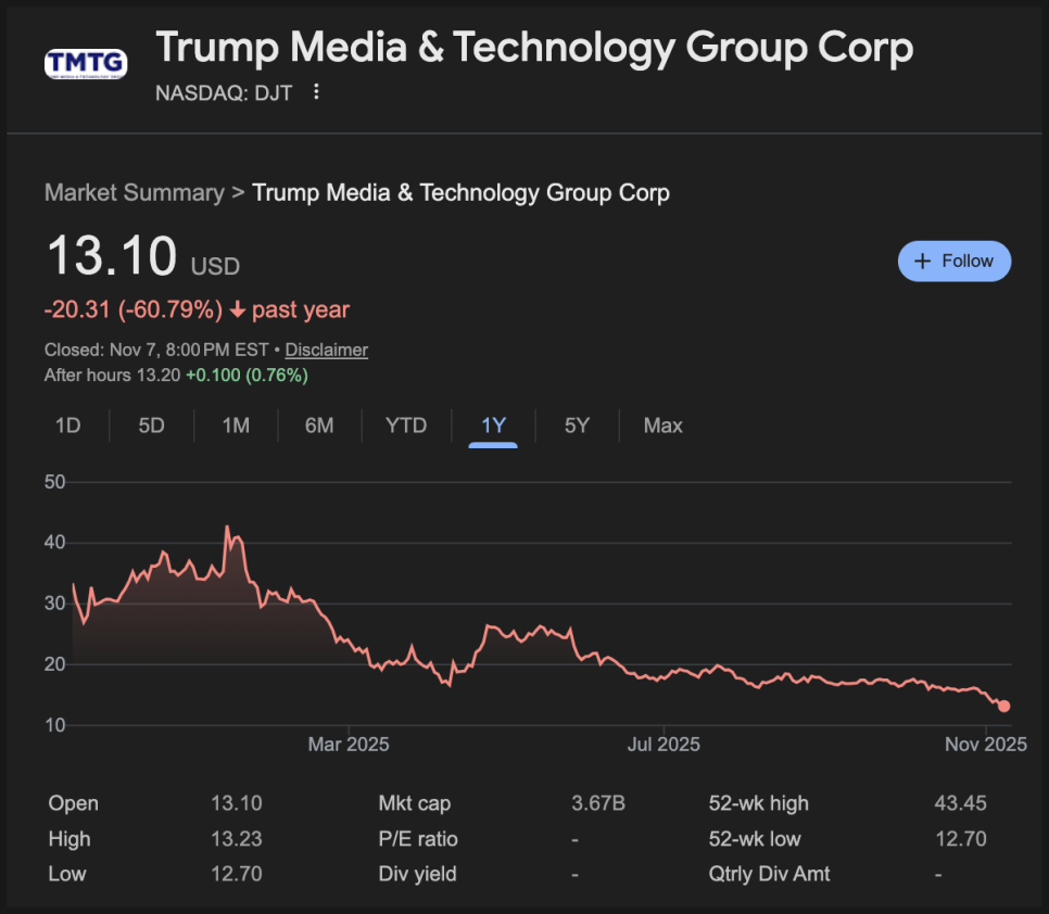그 여파로 트럼프 미디어(DJT) 주가도 지난 한 달 간 23% 하락하며 도널드 트럼프의 개인 순자산 약 4억 9천만 달러(한화 약 6,800억 원)가 증발했습니다. 참고로 지난 1년 간 DJT 주가는 무려 60% 떨어진 상태입니다.