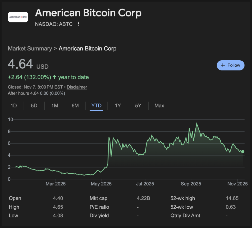 그리고 아메리칸 비트코인 ABTC 주가 역시 최근엔 주가 상황이 좋지 않은데요. 상장 이전보다는 가격이 많이 뛰었지만 고점 대비 약 30% 떨어진 상태입니다.