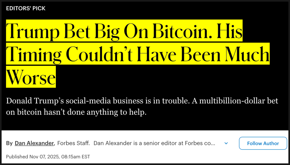 이처럼 세계 최고 권력자인 트럼프가 비트코인을 밀고 있으나, 트럼프 가문의 비트코인 사업은 그렇게 순탄치만은 않습니다. 포브스(Forbes)의 보도에 따르면, 도널드 트럼프 본인의 소셜미디어 회사 ‘트럼프 미디어(Trump Media and Technology Group)’가 올해 20억 달러 규모의 비트코인 투자를 단행했지만, 현재 그 결정이 “최악의 타이밍”이었다는 평가가 나오고 있습니다.