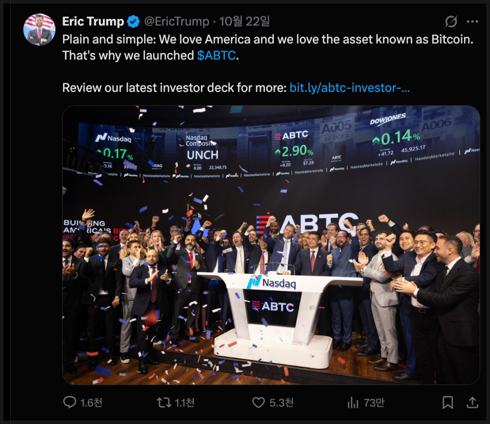 즉, 트럼프 가문이 비트코인 시장에 본격적으로 뛰어들었지만, 타이밍상 고점에 진입했다는 평가가 많고, 정치적 이미지와 상징성에 비해 실질적인 수익은 불투명하다는 분석인데요. 그럼에도 불구하고 트럼프 형제의 아메리칸 비트코인과 트럼프 미디어 모두, “비트코인을 미국 경제의 중심 자산으로 만들겠다”는 메시지를 분명히 내고 있습니다.