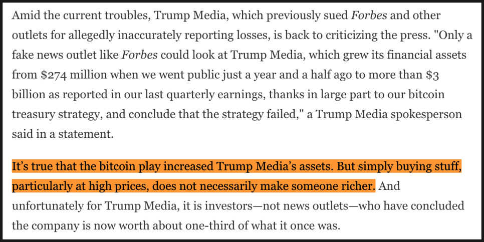 트럼프 미디어 측은 “1년 반 전 상장 당시 2억 7,400만 달러였던 자산이 최근 실적에서 30억 달러를 넘었다”며 “이는 비트코인 트레저리 전략 덕분”이라고 주장했지만, 포브스는 “단순히 비싼 자산을 사들였다고 해서 부자가 되는 것은 아니다”라고 지적했습니다.