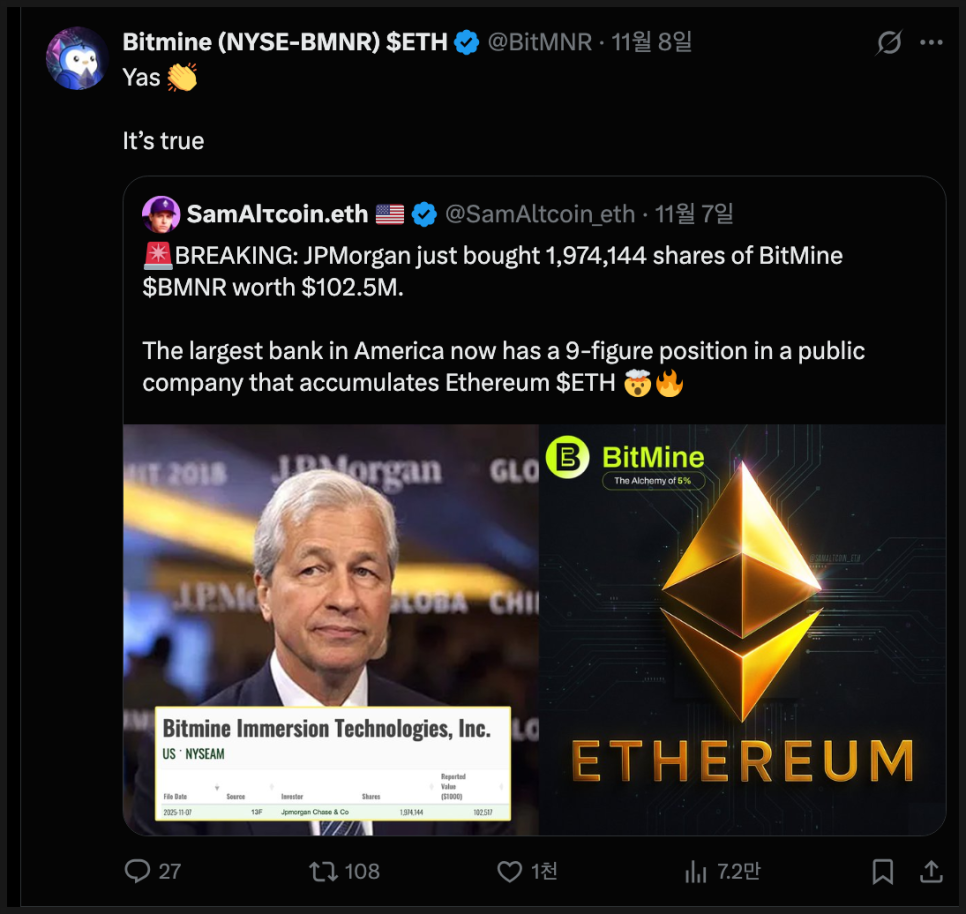 그런데 캐시우드의 아크 인베스트에 이어, 전통 금융의 상징인 JP모건(JPMorgan)도 비트마인 주식을 매수함으로써 이더리움 시장에 발을 들였다는 소식도 있었습니다.