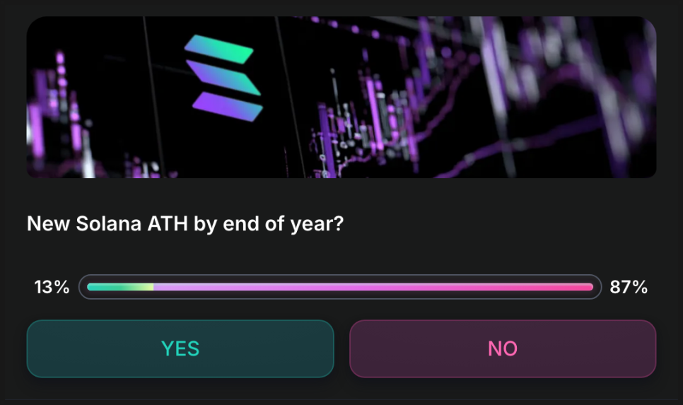 하지만 그와 별개로 솔라나 코인에 대한 기대치는 현재 높지 않습니다. 예측 시장에서 '올해 안으로 솔라나가 역사상 최고치를 찍을 수 있을 것인가'에 대한 부분에 긍정적으로 베팅을 한 사람은 13%에 불과했기 때문이죠.