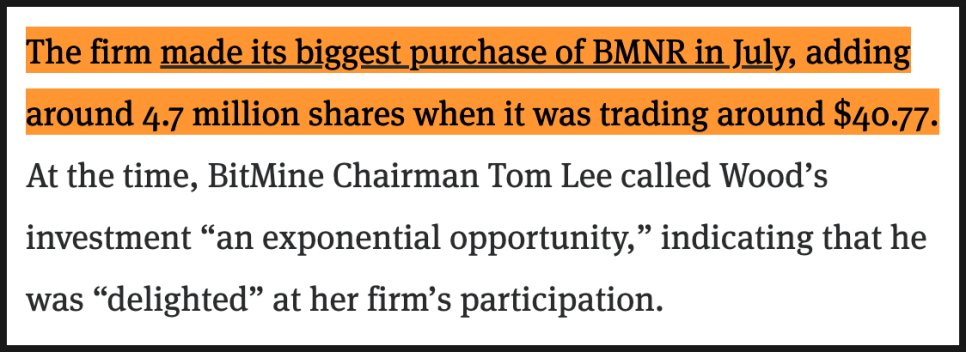 아크인베스트가 비트마인을 처음 대규모 매수한 시점은 올해 7월이었습니다. 당시 약 470만 주를 주당 40달러대에 매입했으며, 비트마인의 회장인 톰 리(Tom Lee)는 “이번 투자는 기하급수적 성장의 기회”라며 “아크의 참여를 매우 기쁘게 생각한다”고 밝힌 바 있습니다.