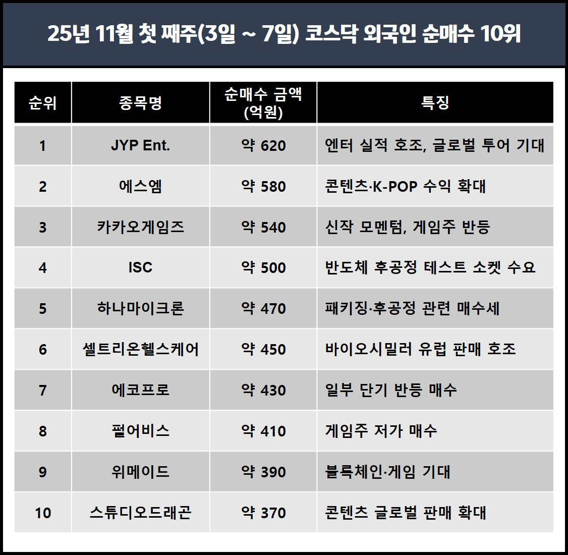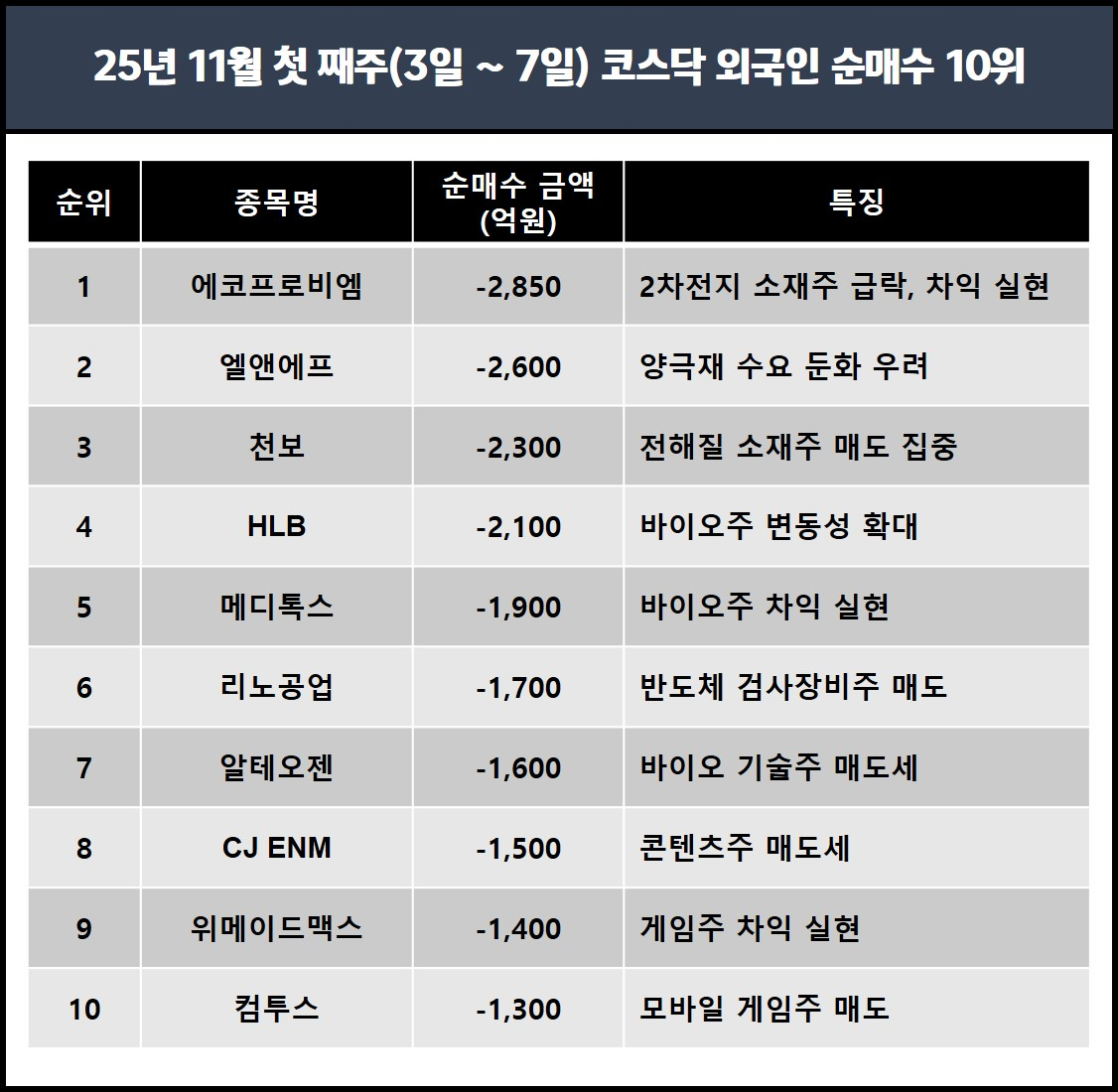 02. 11월 첫 째주 코스닥 외국인 매수·매도 TOP10 종목 및 특징