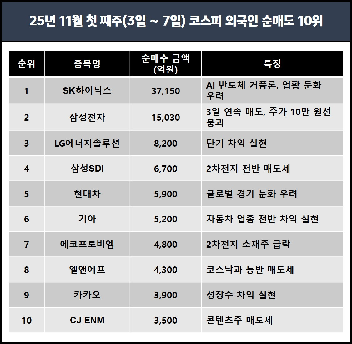 11월 첫 째주 동안 외국인은 코스피 시장에서 7조 2640억 규모 역대 최대 순매도를 기록했습니다. 반도체, 2차전지 대형주 위주의 순매도가 이루어졌으며, 반면 금융·바이오·방어주 위주로 순매수세가 유입되었습니다.