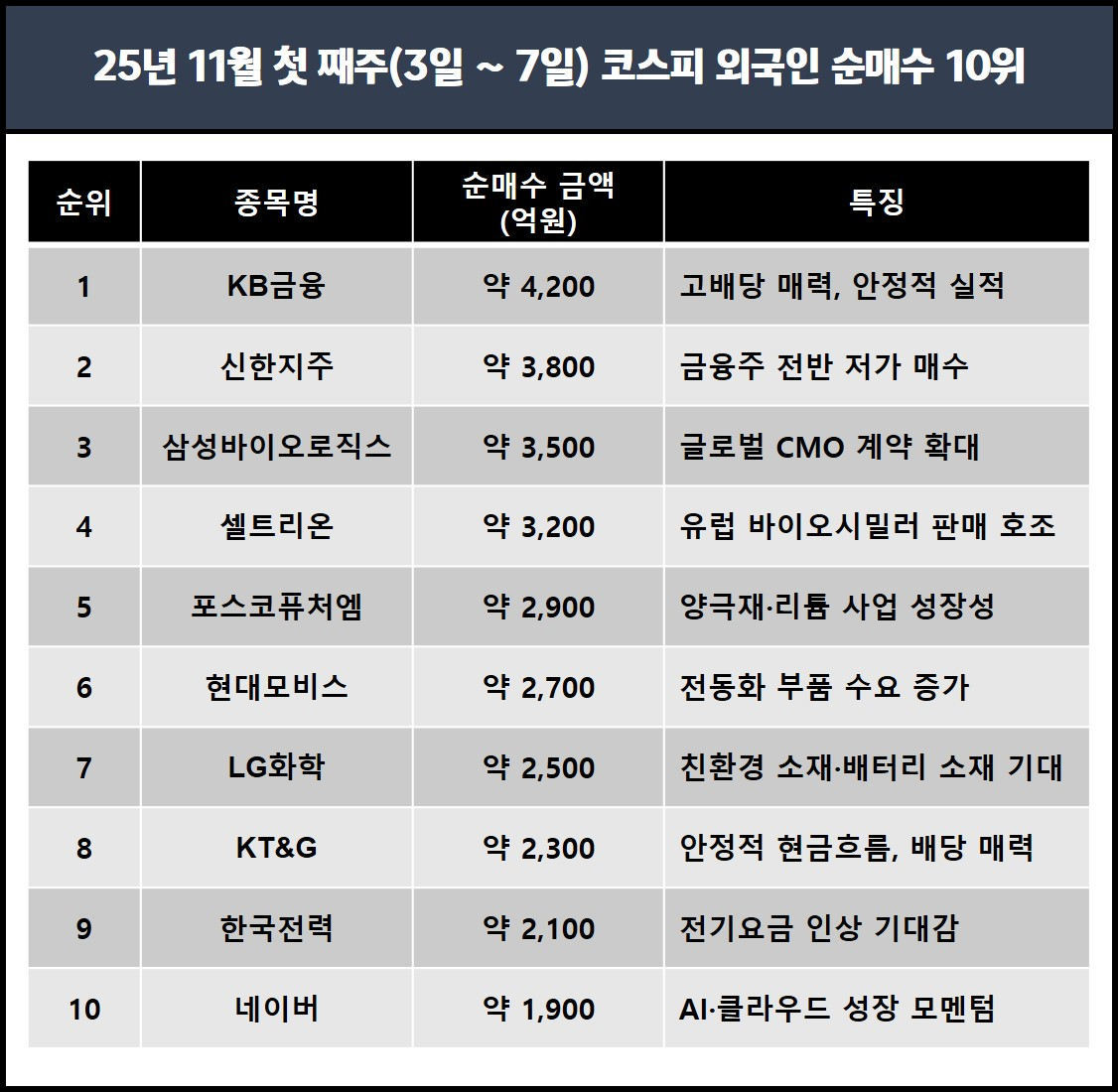 ● 11월 첫째주 외국인 순매수 종목 1위는 금융 대장주 'KB 금융주식' 입니다. 안정적인 실적을 바탕으로 고배당 매력이 부각되며 순매수 약 4,200억원 기록하였으며, 2위는 신한지수, 3위는 삼성바이오로직스를 집중 매수하였네요.