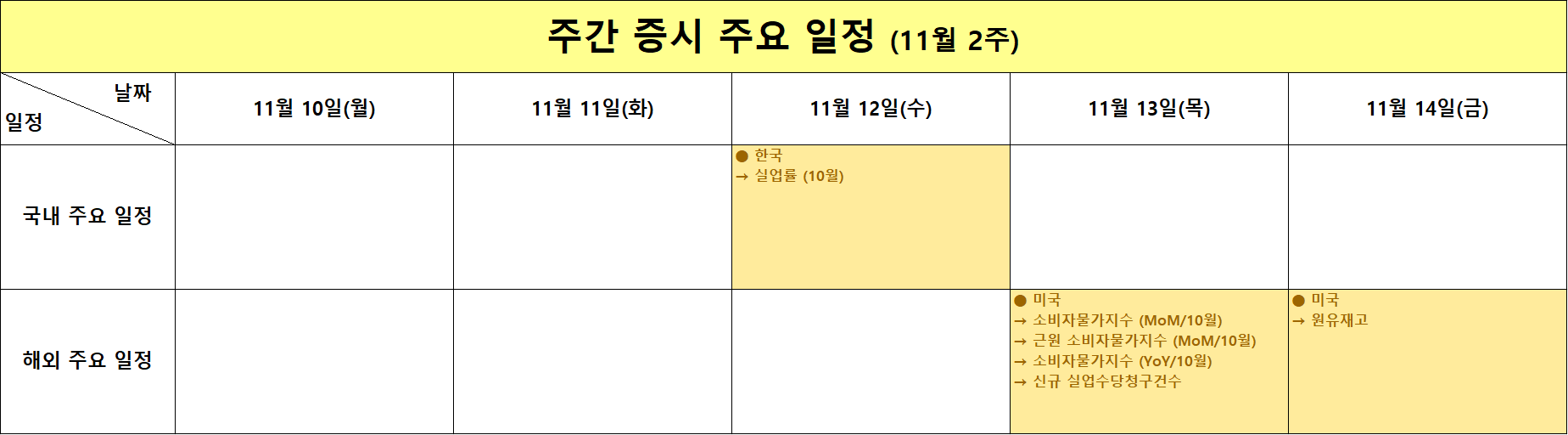 국내에서는 11월 12일 수요일에 10월 실업률이 발표되고 해외에서는 11월 13일 목요일에 미국의 소비자물가지수(CPI)가 공개될 예정입니다. 이번 CPI 발표는 연준의 향후 금리정책 방향을 가늠할 수 있는 핵심 변수로 꼽히기 때문에 시장이 발표 전까지 보수적인 흐름을 유지할 가능성이 높습니다.