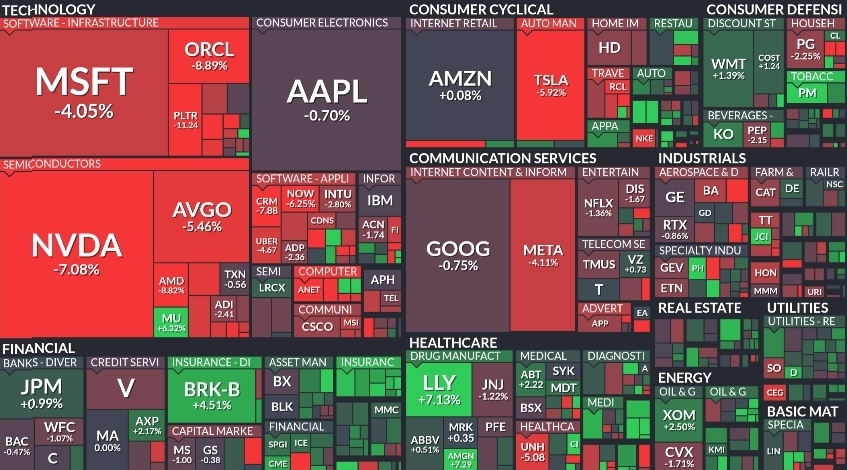 이번 하락의 핵심은 기술주 중심의 차익 매물과 함께 물가 지표를 앞둔 경계심리였습니다. 특히 시가총액 상위 기업인 마이크로소프트(-4.05%), 엔비디아(-7.08%), 브로드컴(-5.46%), 오라클(-8.89%)이 일제히 약세를 보이며 기술 섹터가 크게 흔들렸습니다. AI 관련주의 단기 과열 해소와 반도체 업황 둔화 우려가 겹치면서 투자심리가 빠르게 냉각된 모습이었습니다.