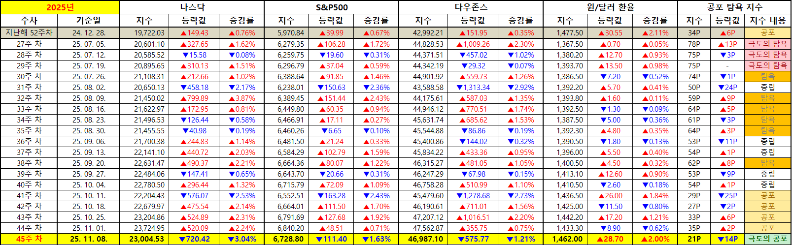이번 주는 글로벌 증시 전반이 급격히 흔들리며 투자자들의 긴장감이 높아진 한 주였습니다. 미국 주요 지수가 일제히 하락했고 원·달러 환율은 다시 1,460원을 돌파하며 외환시장의 불안감도 확대되는 모습이었습니다. 특히 기술주 중심의 나스닥이 -3.04% 하락하면서 변동성이 컸고 S&P500과 다우지수도 각각 -1.63%, -1.21%의 조정을 받았습니다. 환율은 전주 대비 +28.7원 급등해 2.0% 상승했고 공포 탐욕 지수는 21포인트로 내려가며 ‘극도의 공포’ 구간으로 진입했습니다. 단기 조정 이상의 불안심리가 시장에 반영된 주간이었습니다.