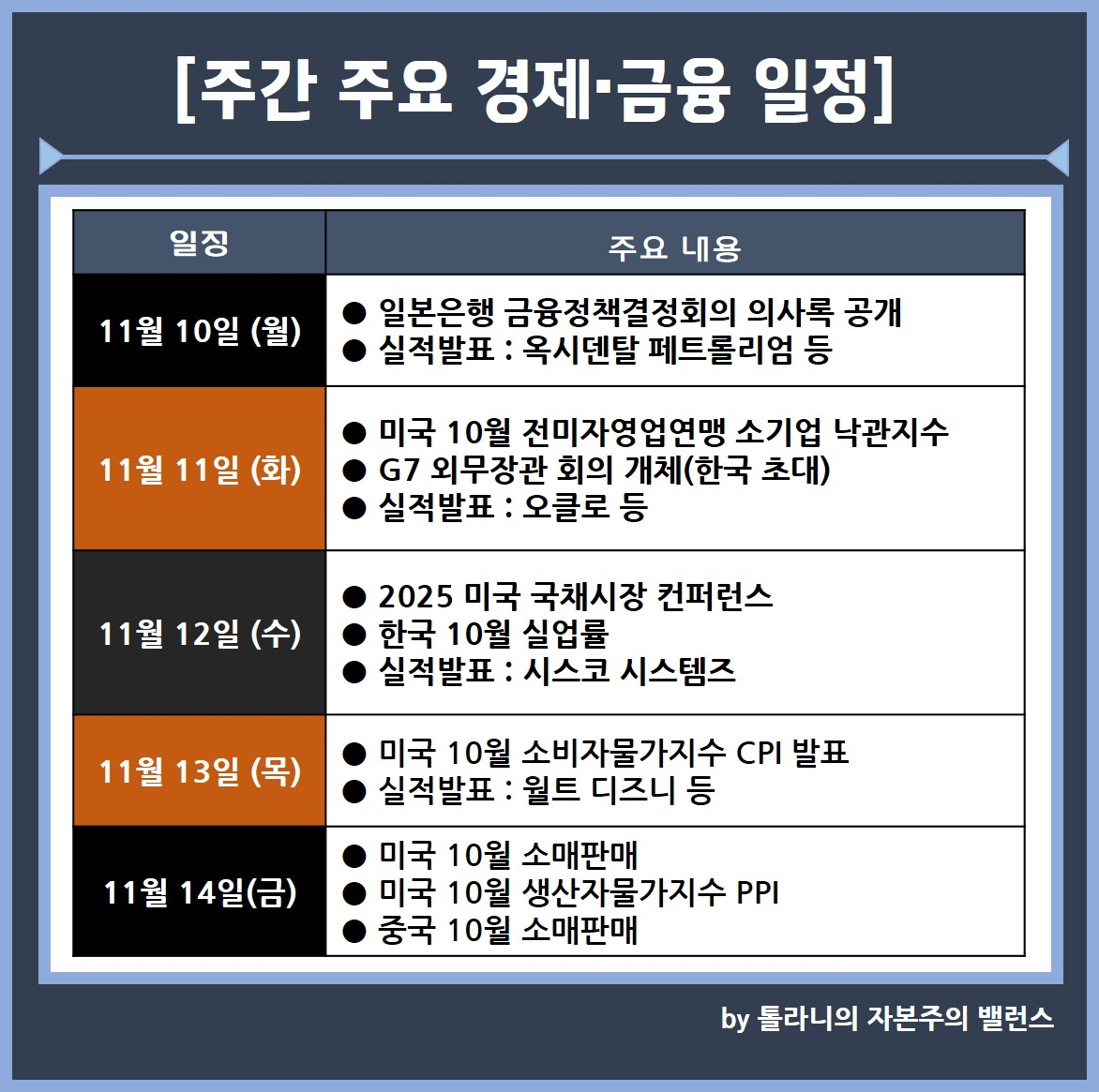 이번 주는 41일째 이어지고 있는 미국 연방 정부의 셧다운 변화, 미국 10월 소비자물가지수 CPI, 소매판매 그리고 생산자물가지수 PPI 발표 등이 미국 증시에 영향을 줄 것으로 전망하고 있습니다.