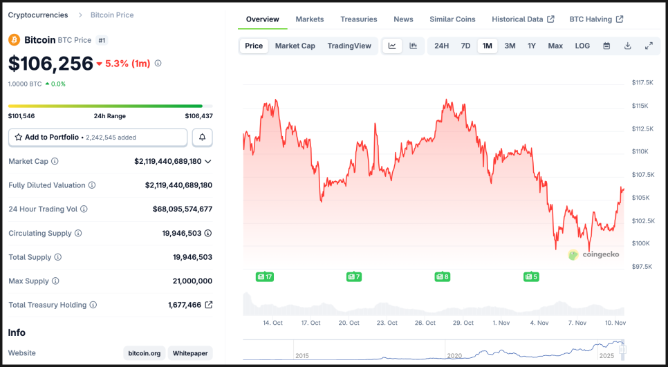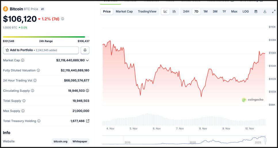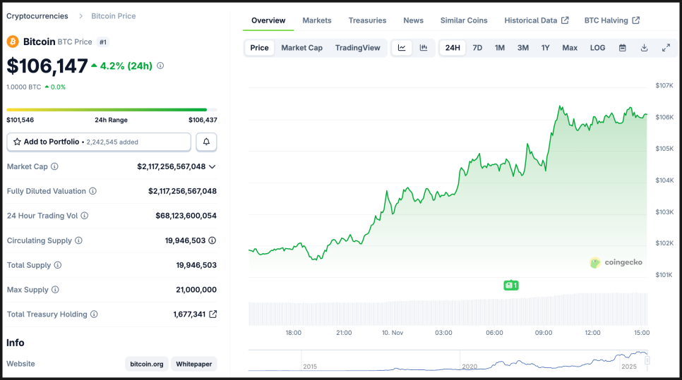 현재 비트코인은 정확히 그 조건을 충족하며 10만 6천 달러 위에서 거래되고 있습니다.