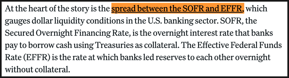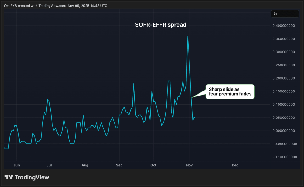 정치 뉴스 외에도 조금 더 근본적인 요인이 있다는 분석도 있습니다. 바로 달러 유동성의 회복입니다. 최근 며칠 사이, 미국 금융시장의 대표적 유동성 지표인 SOFR-EFFR 스프레드가 급격히 축소됐습니다. (SOFR은 ‘담보부 익일금리(Secured Overnight Financing Rate)’로, 은행이 국채를 담보로 자금을 빌릴 때 적용되는 금리이고, EFFR은 ‘실효 연방기금금리(Effective Federal Funds Rate)’로, 담보 없이 은행끼리 단기 자금을 빌릴 때 적용되는 금리입니다.)