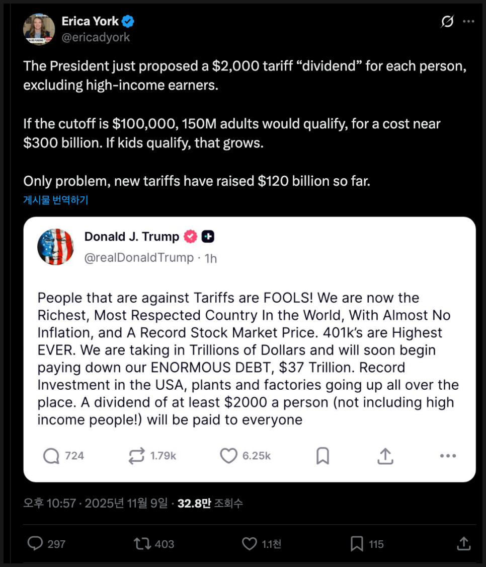 또한 미국 조세재단의 에리카 요크(Erica York) 부회장은 “관세 수입이 지금까지 약 1,200억 달러에 불과한데, 성인 1억 5천만 명에게 2천 달러를 지급하려면 3천억 달러가 필요합니다. 현실적으로 자금이 맞지 않습니다”라고 분석했습니다.