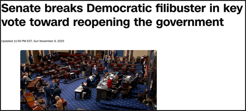 하지만 정치적 교착이 풀릴 조짐이 보이자 시장의 흐름이 급격히 반전되고 있는 건데요. 이번 예산안은 오는 1월 30일까지 정부를 운영할 수 있도록 자금을 확보하고, 최근의 연방 공무원 해고 조치를 되돌리는 내용을 포함하고 있습니다. 또한 의료보험 세액공제 연장안을 12월에 표결하기로 합의해, 중도 성향의 민주당 의원들의 찬성을 이끌어냈습니다.