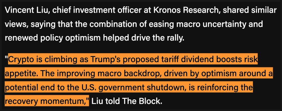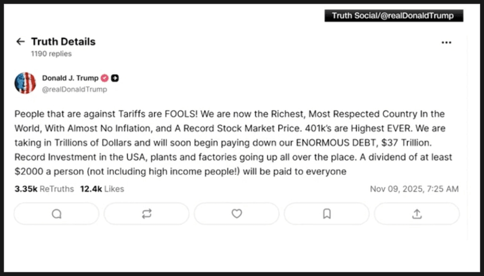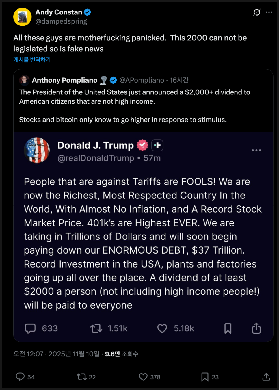 이번 비트코인 반등의 또 다른 촉매제는 트럼프 대통령의 ‘관세 배당’ 발언이었습니다. 트럼프 대통령은 주말 동안 자신의 SNS 트루스소셜(Truth Social)에 “미국 국민 대부분에게 최소 2,000달러의 관세 배당(dividend)을 지급하겠다”고 밝혔습니다. 그는 “미국이 막대한 관세 수익을 올리고 있으며, 이를 국민 배당과 국가 부채 감축에 사용하겠다”고 설명했죠.