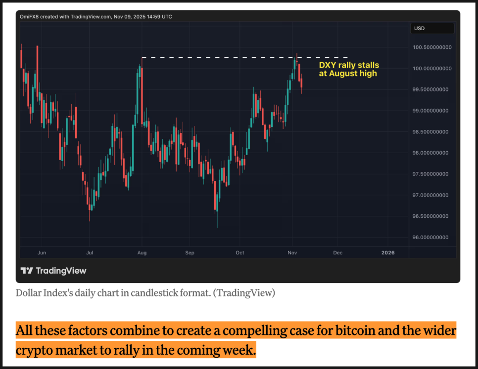 코인데스크의 옴카르 고드볼레(Omkar Godbole)는 “이 모든 지표가 합쳐지면 비트코인과 암호화폐 시장 전반에 우호적인 환경이 만들어진다'며 이번 주에도 상승세가 이어질 가능성이 높다고 전망했습니다.
