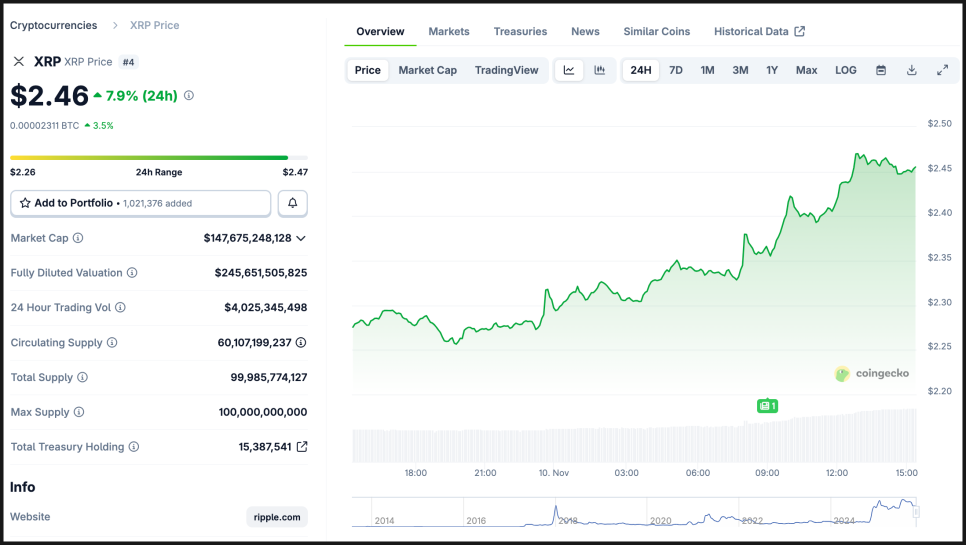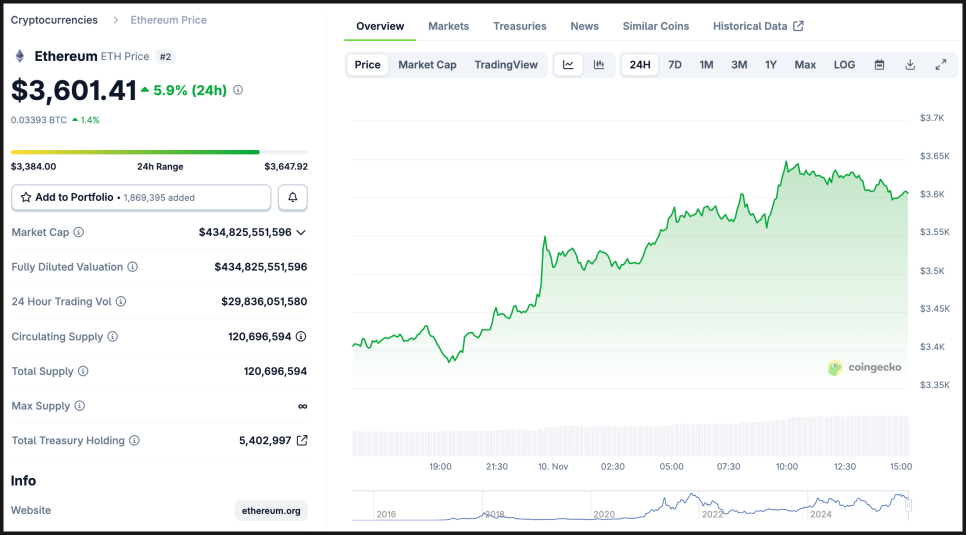 이더리움은 7% 이상 급등해 3,630달러 부근까지 올랐습니다. 정치적 교착이 해소되며 불확실성이 줄어들자, 투자자들은 다시 위험자산으로 눈을 돌리고 있는 모습입니다.