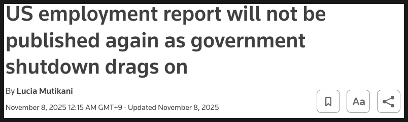 셧다운 기간 동안 미국 연방정부 산하 기관들은 소비자물가, 고용지표, 제조업지수 같은 핵심 데이터를 발표하지 못했습니다. 이런 데이터는 연준(Fed)의 통화정책 결정의 핵심 근거인데요, 정보가 끊기면 연준 역시 움직일 수 없게 됩니다.