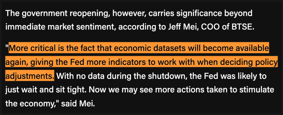 BTSE의 최고운영책임자 제프 메이(Jeff Mei)는 이렇게 말했습니다. “셧다운 자체보다 중요한 건, 이제 다시 경제 지표를 확인할 수 있게 됐다는 점입니다. 연준은 데이터를 보고 정책을 결정합니다. 이제 연준이 다시 움직일 수 있는 환경이 만들어진 셈이죠.”