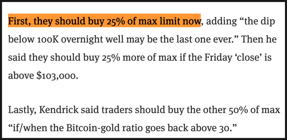 그는 지난 11월 6일 인터뷰에서 이번 조정을 “마지막 기회일 수도 있는 조정”이라고 표현하며, 전체 투자금 중 25%를 10만 달러 초반 구간에서 바로 매수하라고 조언했죠. 그리고 주말 종가가 10만 3천 달러를 넘는다면 추가 매수 신호로 해석하라고 했습니다.