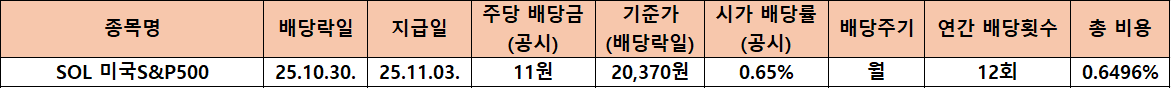 SOL 미국 S&P500 ETF의 2025년 11월 기준 주당 배당금은 ‘11원’, 시가 배당률은 ‘0.65%’로 공시되었습니다. 배당락일은 10월 30일 지급일은 11월 3일이며 기준가는 20,370원이었습니다. 최근 3년간 데이터를 보면 배당금은 월별 등락이 반복되었는데 2023년과 2024년을 비교하면 배당금은 평균 10~15% 내외로 등락했고, 2025년 들어서는 성장세가 일부 둔화된 모습이 관찰됩니다.
