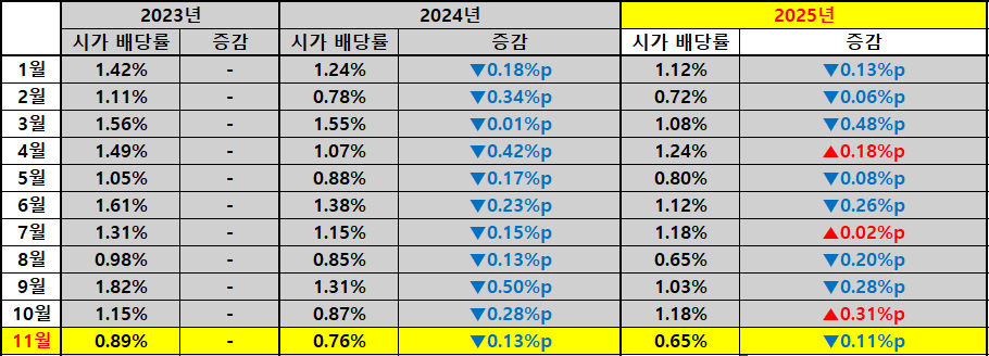 배당금은 정체되어 있지만 주가가 상승함에 따라 시가 배당률은 자연스럽게 하락하는 구조를 보이고 있습니다. 2024년 11월의 시가 배당률은 0.76%였고 올해는 0.65%로 ‘0.11%p’ 감소했습니다. 이는 ‘주가 상승에 따른 명목 수익률 희석’으로 해석할 수 있습니다. 즉, 배당금이 줄지 않아도 주가가 오르면 배당률은 낮아지는 구조입니다.