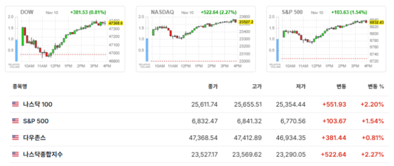 셧다운 종료 기대감이 시장 심리를 반전시켜 대형 기술주 중심 강세 전개