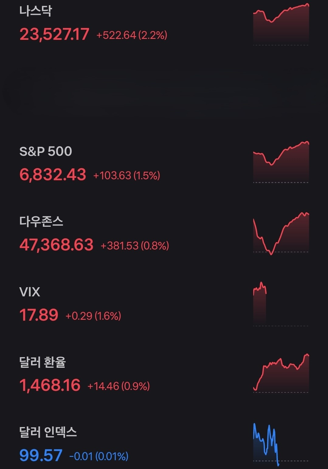 미국 주요 지수는 나스닥이 2%대, S&P500이 1%대, 다우가 1% 미만 상승으로 마감했습니다. 변동성 지수(VIX)는 17대 후반에서 안정 구간을 유지했고 달러 인덱스는 보합권에서 방향성을 탐색했습니다. 원화는 약세를 보이며 환율이 상단을 재시도했고 이는 외국인 수급의 단기 변화와 수익률 괴리를 확대하는 요인으로 작용했습니다.