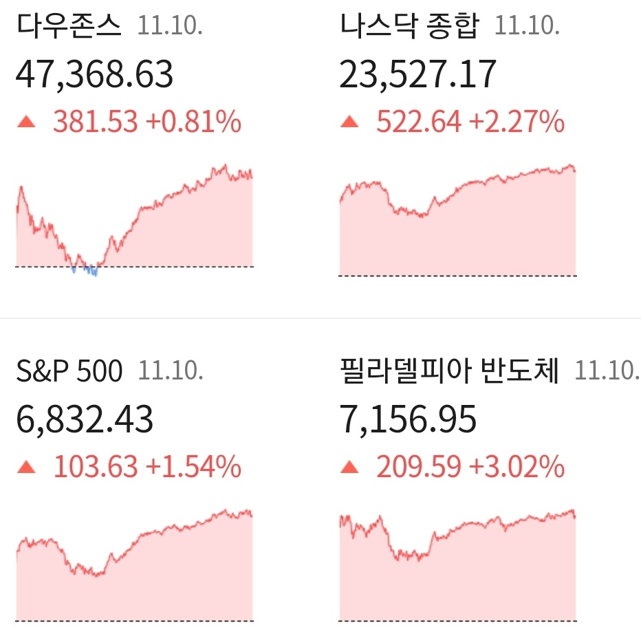 이로 인하여 현지시간 10일 뉴욕증시 3대 지수가 일제히 상승 마감했습니다. 다우지수는 전거래일 대비 0.81% 오른 4만7368.63에 마감했으며, 대형주 중심의 S&P500지수는 1.54% 오른 6832.43에 거래를 마쳤습니다. 기술주 위주의 나스닥지수는 2.27% 오른 2만3527.17에 거래를 마치며 장을 마감하였는데요.