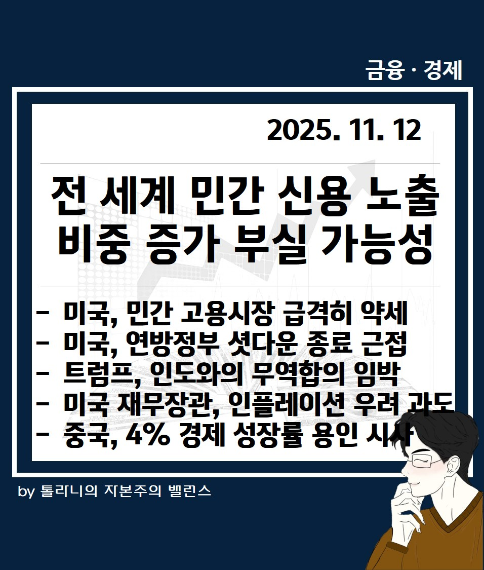 지금까지 '전 세계 민간 신용 노출 비중 증가 부실 가능성, 미국 민간 고용시장 약세 등 뉴욕 증시 및 주요 국가 경제·금융 동향' 관련하여 알아보았는데요.