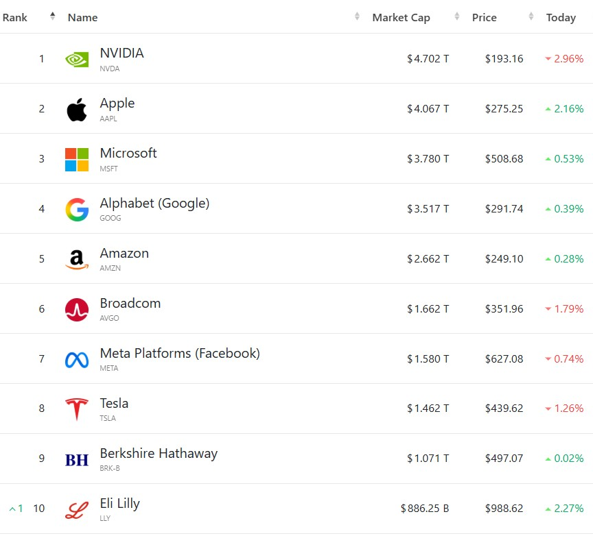 전날 큰 폭으로 상승한 엔비디아는 전일 대비 -2.96% 하락하였으며, 메타 -0.74%, 테슬라 -1.26% 하락하였습니다. 반면 애플 +2.16%, 마이크로소프트 +0.53%, 알파벳 +0.40%, 아마존 +0.28% 상승하면서 거래를 마쳤습니다.