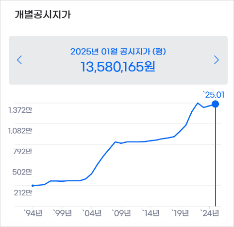 공시지가를 보면 평당 1,350만원 수준이다. 감정평가액은 보통 공시지가의 1.2~1.6배이므로 1.4배하여 감정평가액을 계산해보면, 평당 1,890만원이다. 계산하기 쉽게 대지지분이 다른 조합원들의 평당가를 1,890만원으로 계산해보면 총 조합원 종전자산평가액은 9,706억이다.