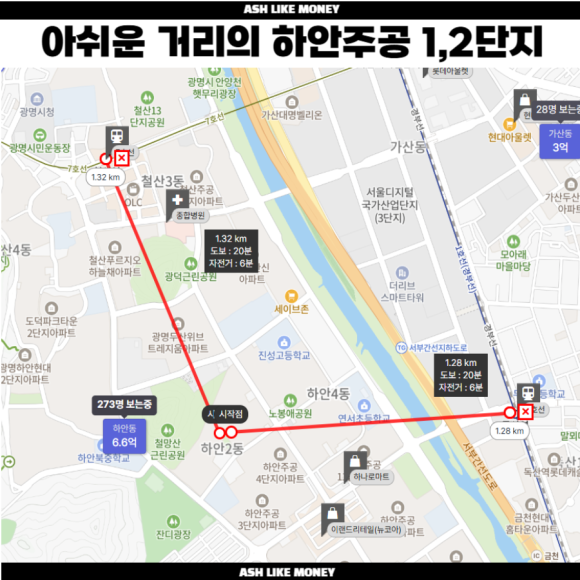 하안주공 1,2단지는 숲세권인데 바로 옆으로 철망산이 있으며 하안초를 안고 있는 초품아이다. 광명시민체육관, 도서관 등이 있지만 역과는 거리가 멀다. 7호선 철산역도 1.3KM 이상이고 독산역도 1KM 정도의 거리라 역세권이 아니라는 단점이 있긴 하지만 버스가 잘 갖추어져 있다. 그리고 오래된 아파트라 주차난이 심하고 중앙난방이라 원할 때 난방을 쓰지 못하고 난방비가 비싸다. 구축이라 방음이 잘 안되고 낡아서 몸테크는 어려울 수도 있다.